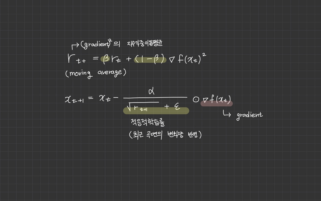 매번 새로운 gradient 제곱의 비율을 반영하여 평균을 업데이트 하는 방식입니다.