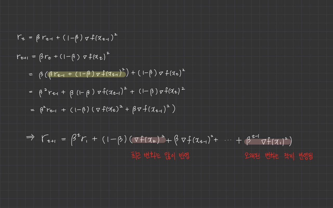 gradient 제곱에 곱해지는 가중치가 지수승으로 변화하기 때문에 지수가중평균이라 부릅니다.