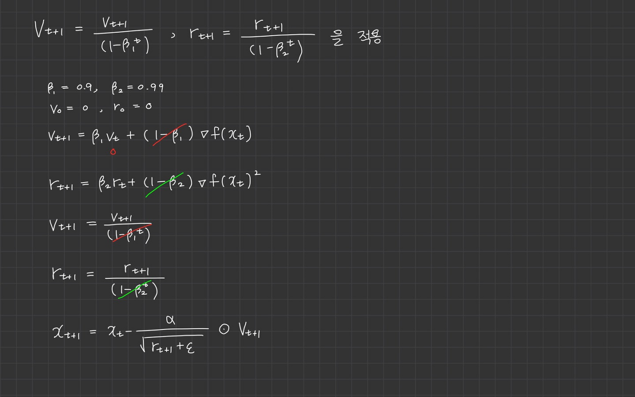 이 방법으로 학습 초반에 학습률이 급격히 커지는 편향이 제거되고, 훈련이 진행될 수록 와 $(1-\beta^t_2)는 1에 수렴하므로 원래 알고리즘 형태로 돌아옵니다.